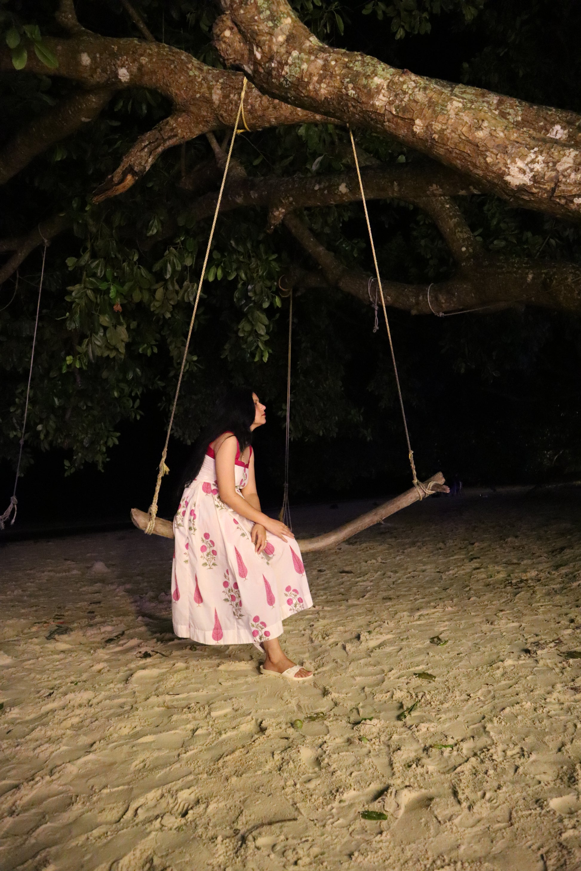 This one’s a love letter to breezy days by the sea. ‘Snow (White) at the Beach’ is light, playful, and quietly striking. Hand block printed with delicate rose motifs and teardrop-like elements in a vibrant pink, it pairs beautifully with the cotton's natural white base. The bold straps and gathered waist add structure without ever compromising on comfort.